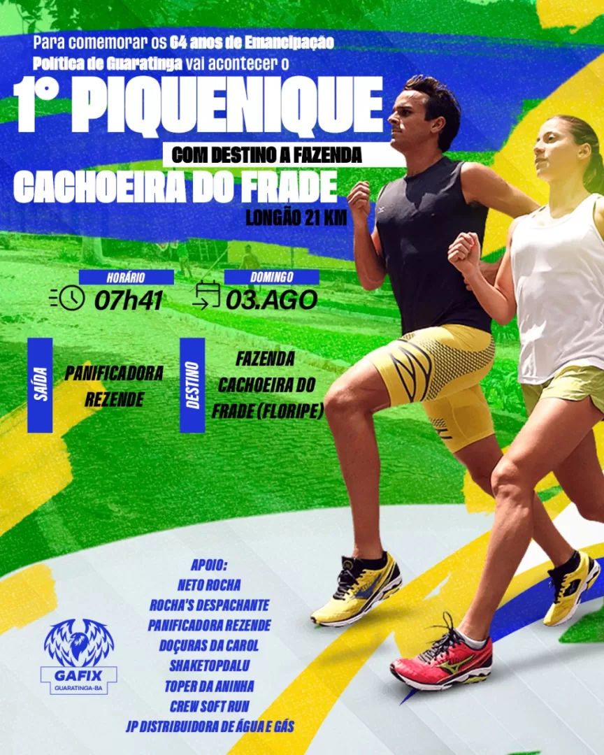 Em comemoração aos 64 anos de emancipação política de Guaratinga, a cidade vai realizar o 1º Piquenique com destino à Fazenda Cachoeira do Frade, no próximo dia 3 de agosto, um domingo. A concentração será às 7h41, com saída em frente à Panificadora Rezende e percurso de 21 quilômetros até a zona rural de Guaratinga, na região da comunidade de Floripe.