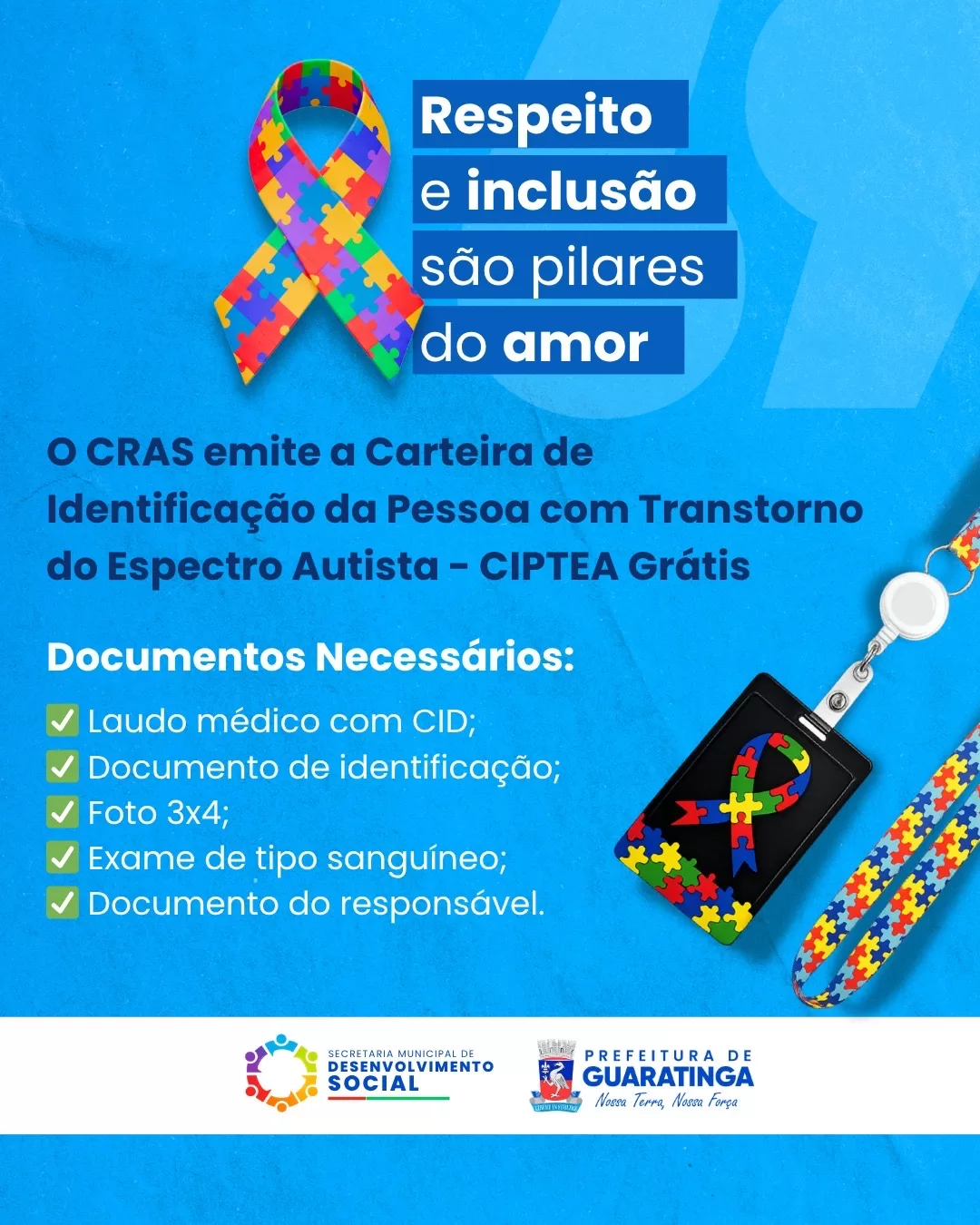 A Prefeitura de Guaratinga, por meio do Centro de Referência de Assistência Social (CRAS), emite gratuitamente a Carteira de Identificação da Pessoa com Transtorno do Espectro Autista (CIPTEA). O documento atende moradores com diagnóstico de TEA e amplia o acesso a direitos.