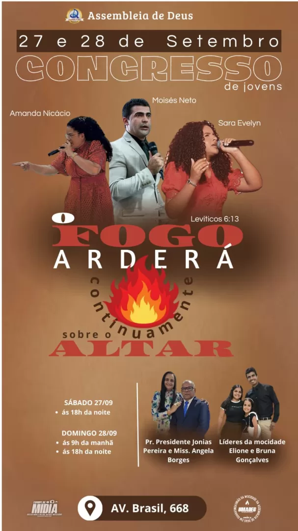 A Igreja Assembleia de Deus de Guaratinga promoverá, nos dias 27 e 28 de setembro, o Congresso de Jovens 2025, com o tema inspirado em Levítico 6:13: “O fogo arderá continuamente sobre o altar”.