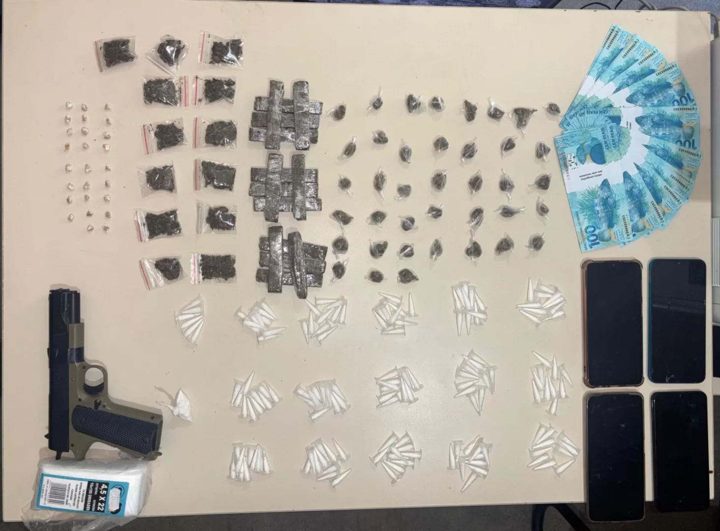 Durante a ação, foram apreendidos 146 pinos de cocaína, 25 pedras de crack, mais de 180 gramas de maconha, 45 cédulas falsas de R$ 100 (totalizando R$ 4.500), sete celulares e um simulacro de arma de fogo.