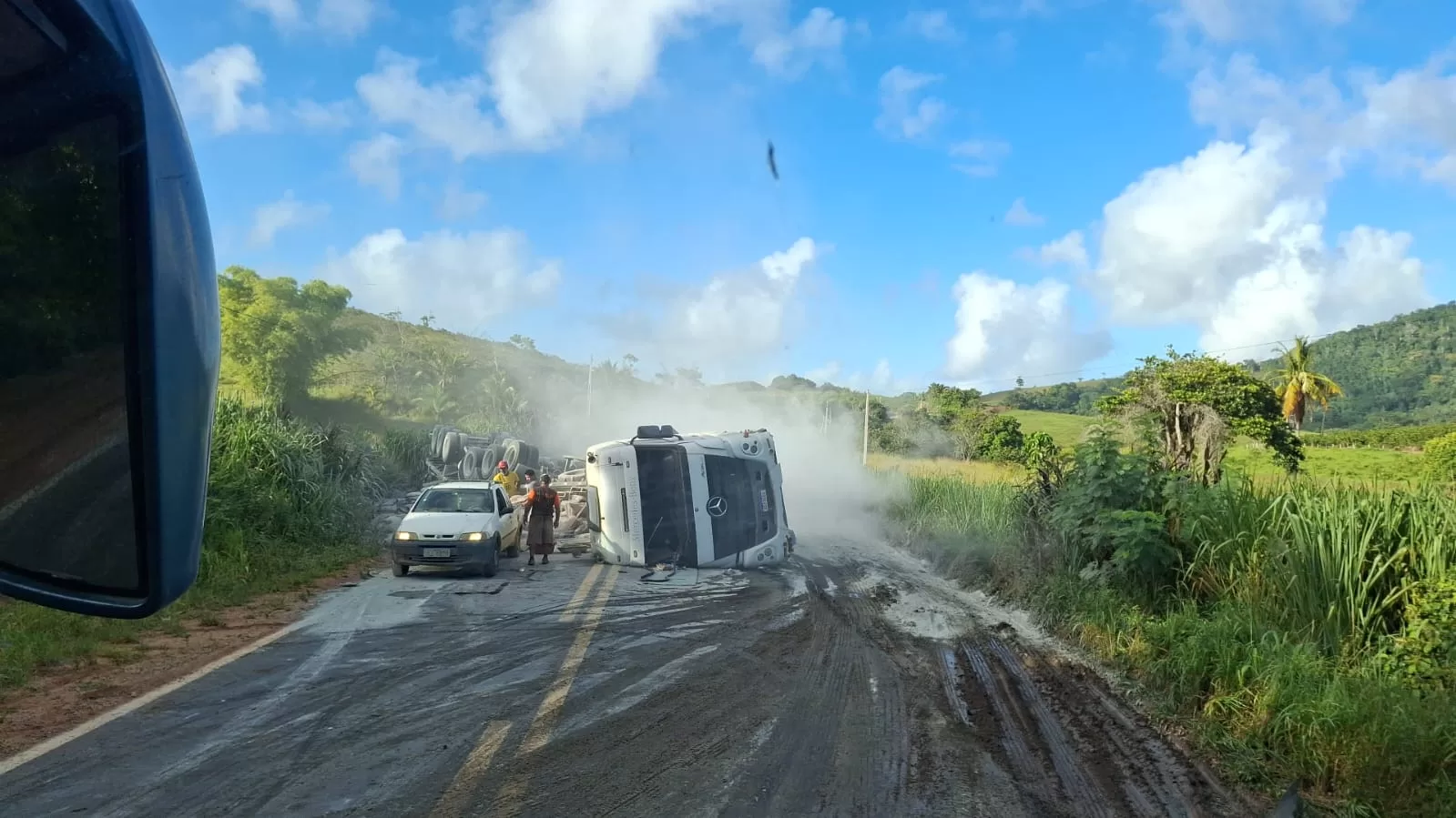 Segundo o motorista, o acidente aconteceu quando ele tentou desviar de um caminhão baú e acabou perdendo o controle do veículo, que tombou no meio da pista. Apesar do susto, o motorista não ficou ferido.