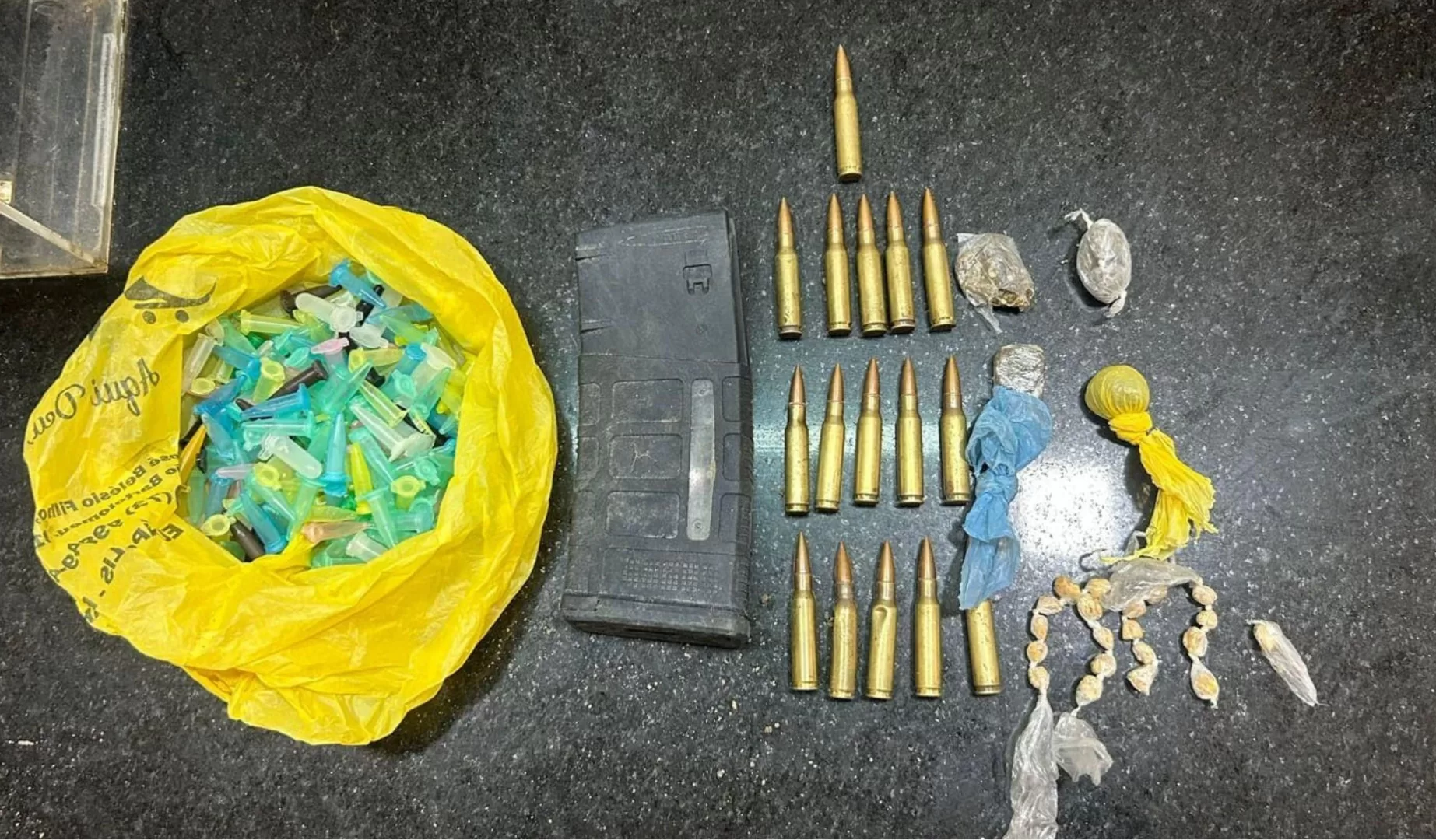 Logo após a captura, os policiais ampliaram as buscas na região. Em uma sacola abandonada, a equipe localizou um carregador de fuzil e 16 munições calibre 7.62.