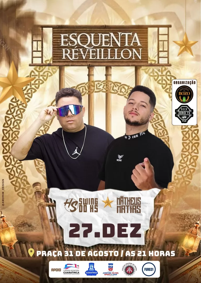 A cidade de Guaratinga se prepara para abrir as celebrações de fim de ano com o Esquenta de Réveillon, evento que será realizado no dia 27 de dezembro, na Praça 31 de Agosto, a partir das 21 horas. A programação contará com apresentações de Swing do HS e Matheus Matias, prometendo uma noite de música, energia e grande presença de público.