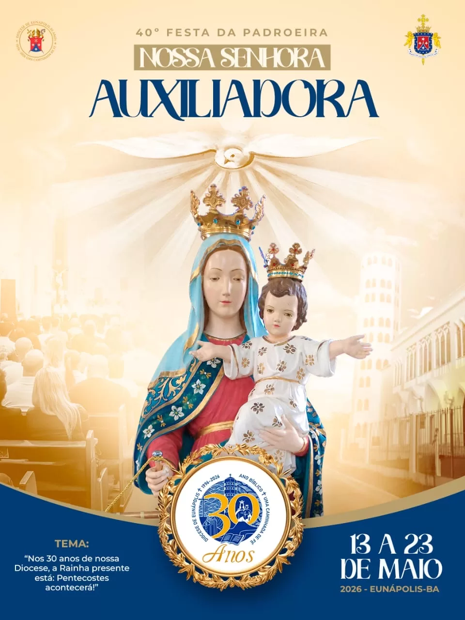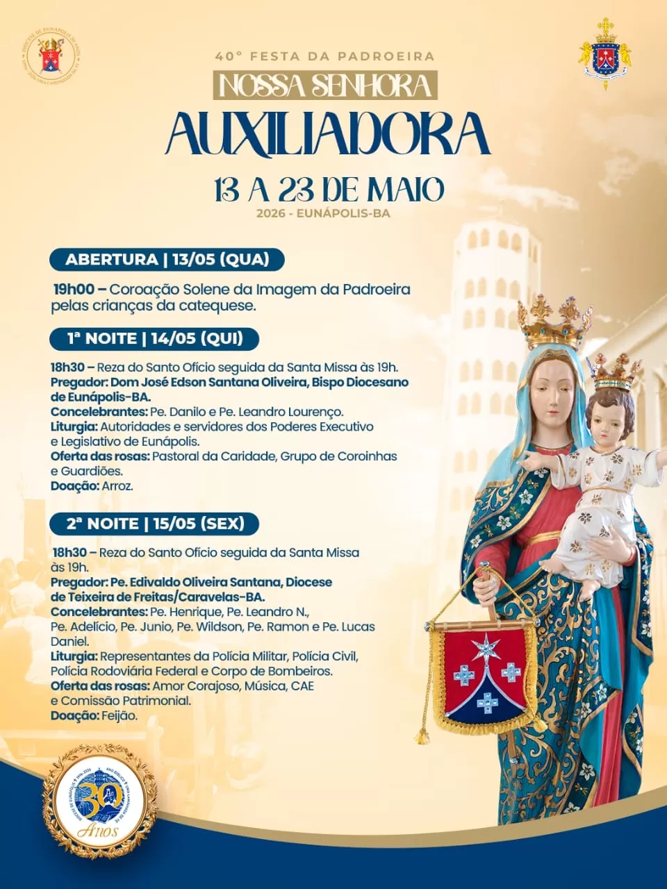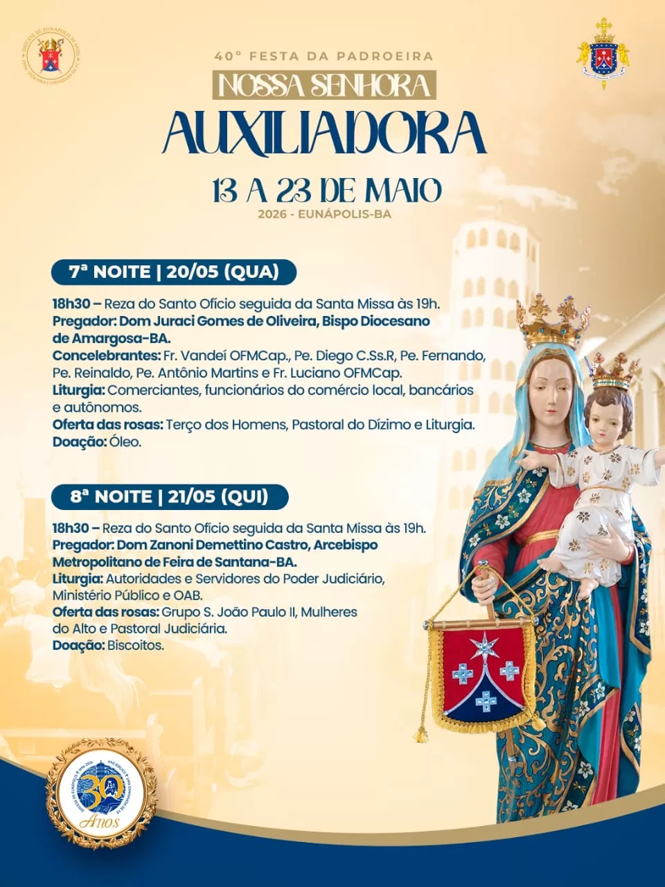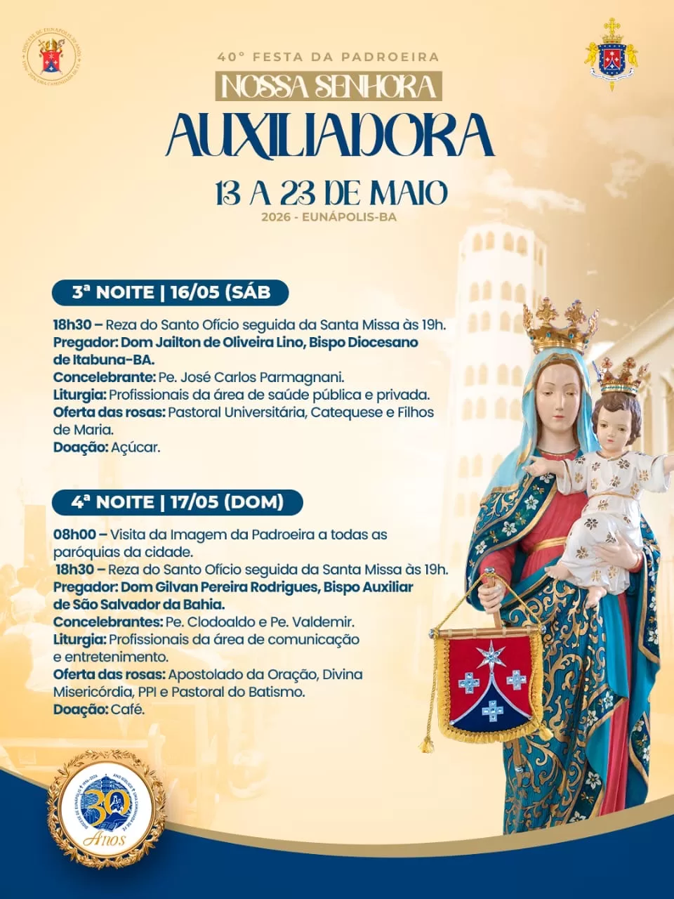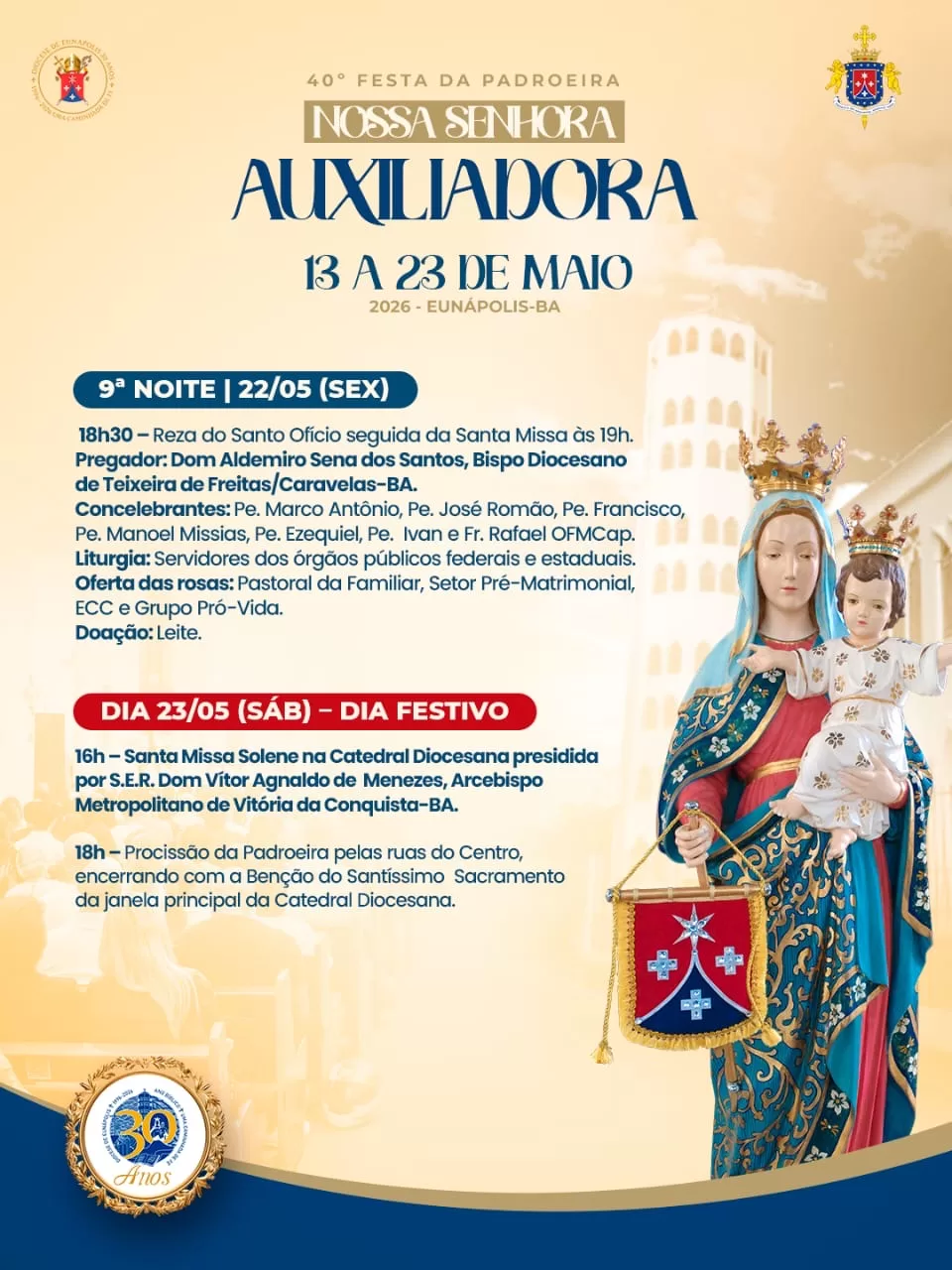 A tradicional novena em honra a Nossa Senhora Auxiliadora será realizada entre os dias 13 e 23 de maio de 2026, em Eunápolis, no sul da Bahia. A programação marca a 40ª edição da festa da padroeira e reúne celebrações religiosas que devem mobilizar fiéis de toda a cidade e região.