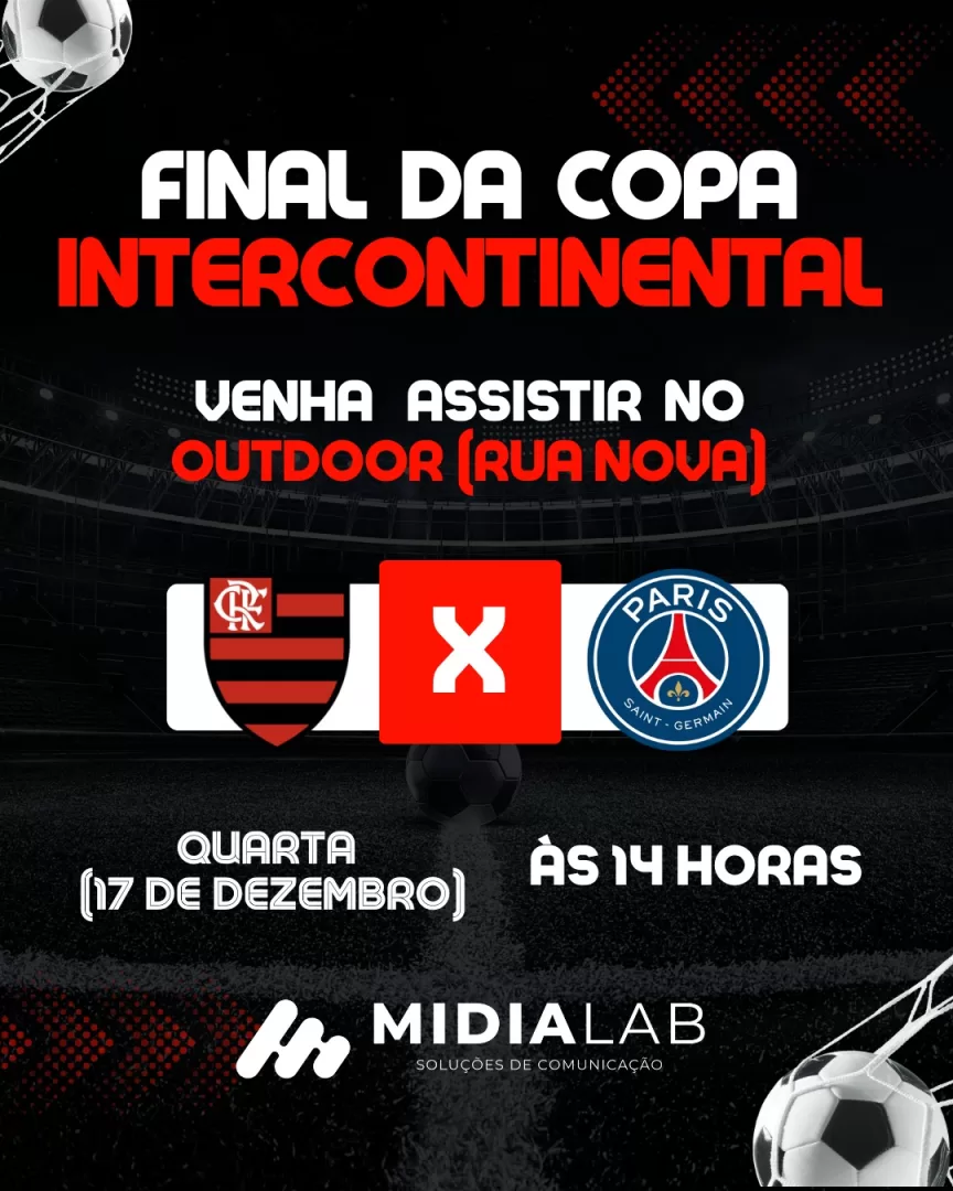 Pela segunda vez, a Rua Nova, em Guaratinga, será palco de uma transmissão esportiva em espaço aberto promovida pela MidiaLab. Desta vez, o público poderá acompanhar a final da Copa Intercontinental, entre Flamengo e Paris Saint-Germain, exibida em um outdoor de LED instalado no local.