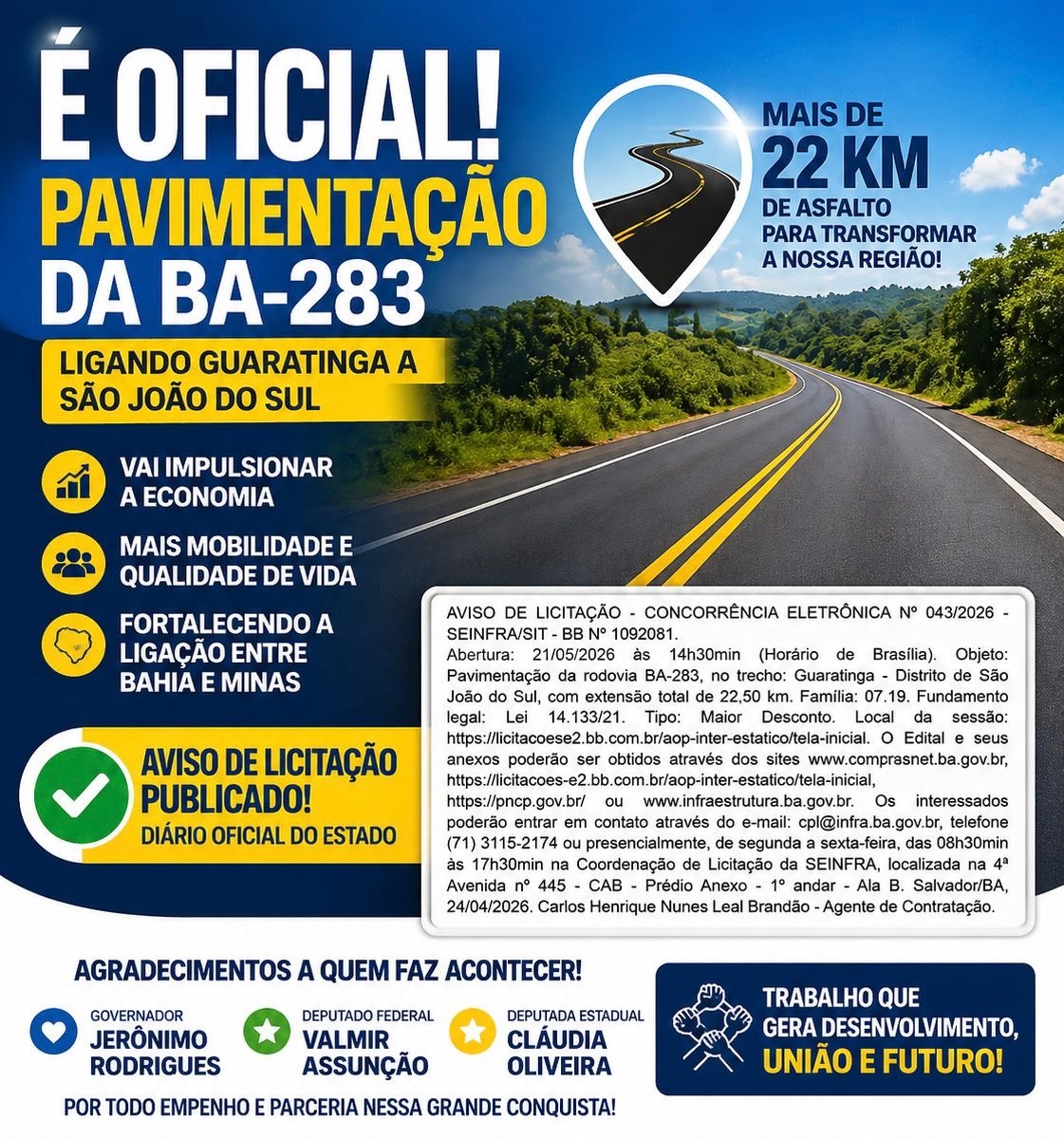O Governo da Bahia formalizou o projeto de pavimentação da rodovia BA-283, no trecho entre Guaratinga e o distrito de São João do Sul. O governo publicou o aviso de licitação no Diário Oficial deste sábado (25), o que oficializa o avanço.