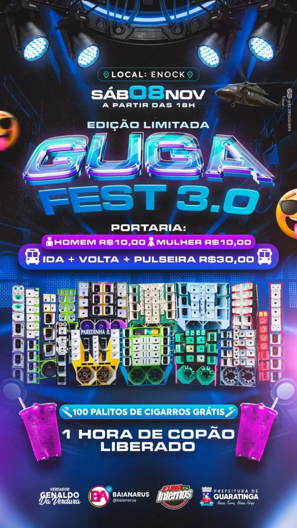A Guga Fest 3.0 conta com o apoio do vereador Genaldo da Verdura, Baianarus, E Uma Internos e Prefeitura de Guaratinga, e promete agitar o fim de semana com muita música e diversão.