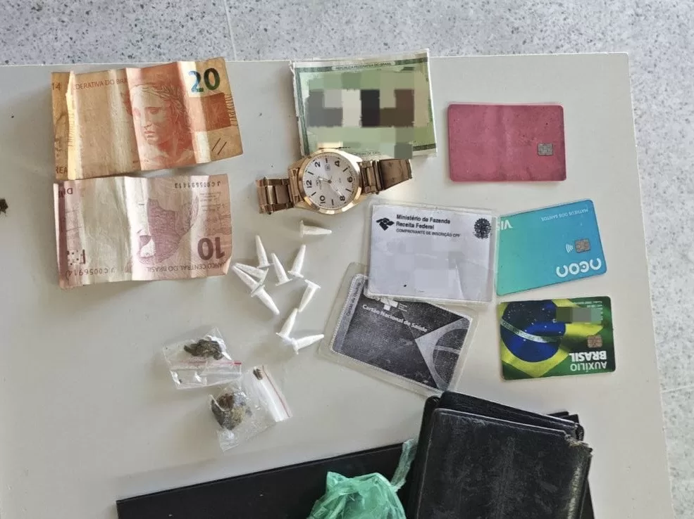 Durante a ação, os policiais apreenderam dez pinos com substância semelhante à cocaína, dois saquinhos com maconha e R$ 30 em espécie.