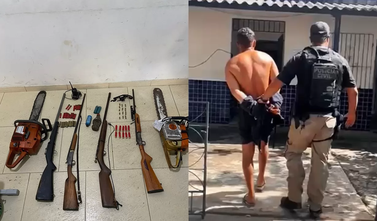 Durante a operação, os policiais encontraram cinco armas de fogo — entre elas um revólver e espingardas de diferentes calibres. Também localizaram munições, espoletas, pólvora e materiais utilizados para recarga artesanal de cartuchos.