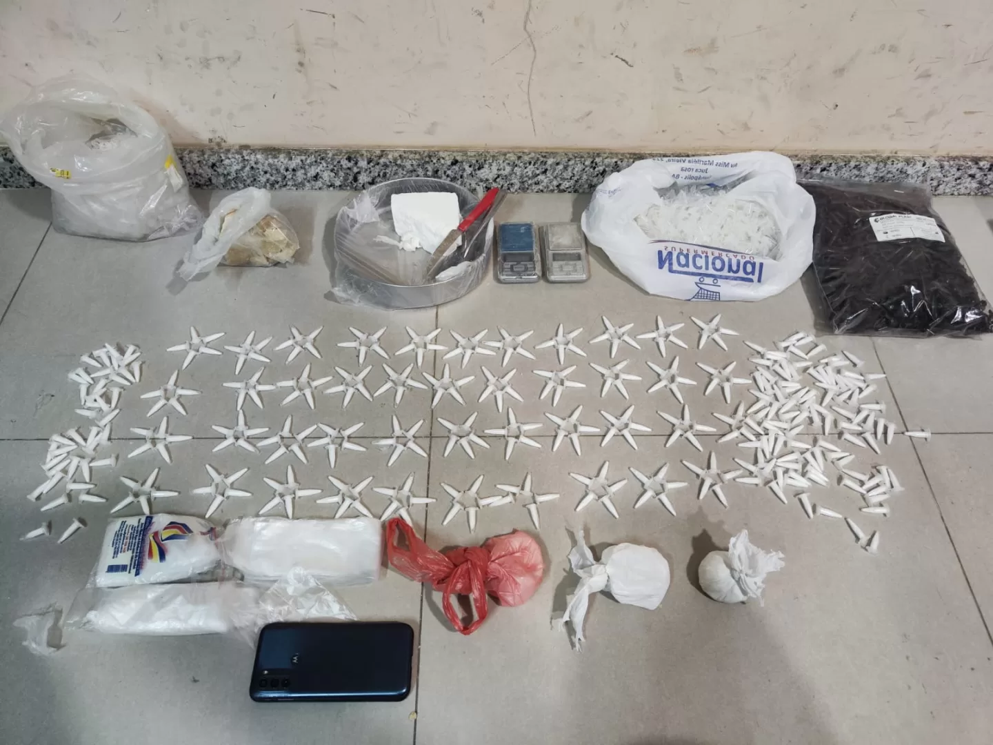 Na ação, foram apreendidos 351 pinos de cocaína pesando 215 gramas, três porções grandes e três pequenas de pó, uma pedra grande de pó pesando 445 gramas, uma pedra grande de crack com 235 gramas, três pacotes com 1.500 eppendorfs cada (embalagens utilizadas para comercialização da droga), duas balanças de precisão, um celular Motorola azul, além de uma chave, uma faca e uma colher.