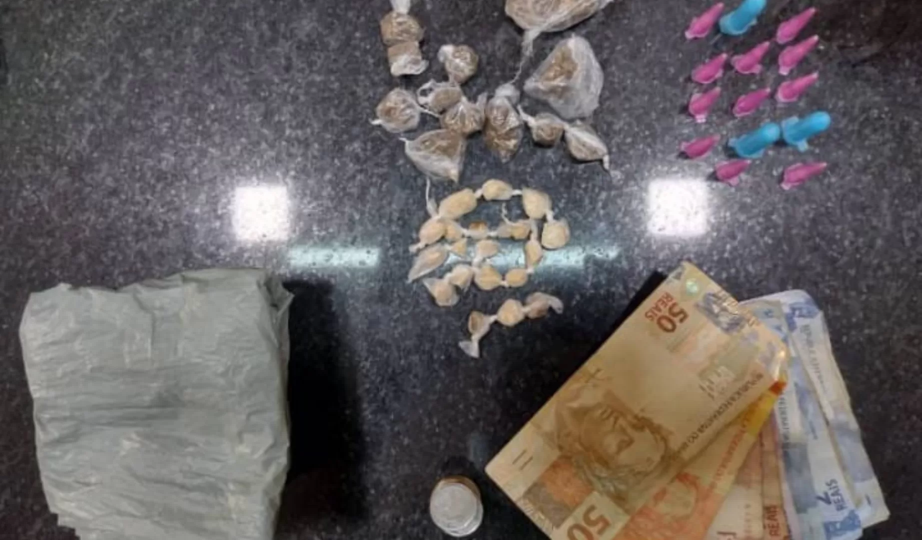 Os policiais deram voz de abordagem e realizaram busca pessoal. Em seguida, recolheram a sacola, onde encontraram 14 pinos de cocaína, 20 pedras de crack e 12 trouxas de maconha.