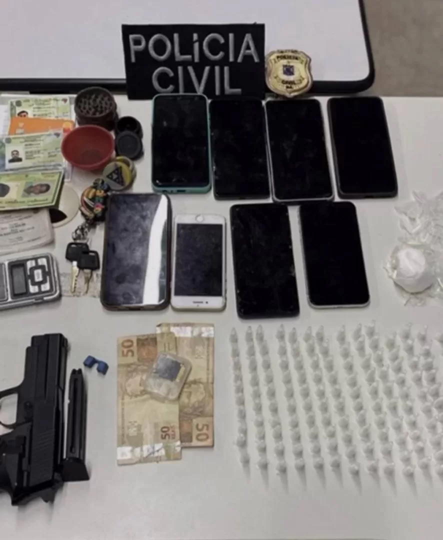 Durante as diligências, os investigadores localizaram um imóvel em condições precárias de higiene, onde estavam vários indivíduos. No local, foram apreendidas drogas e um simulacro de arma de fogo.