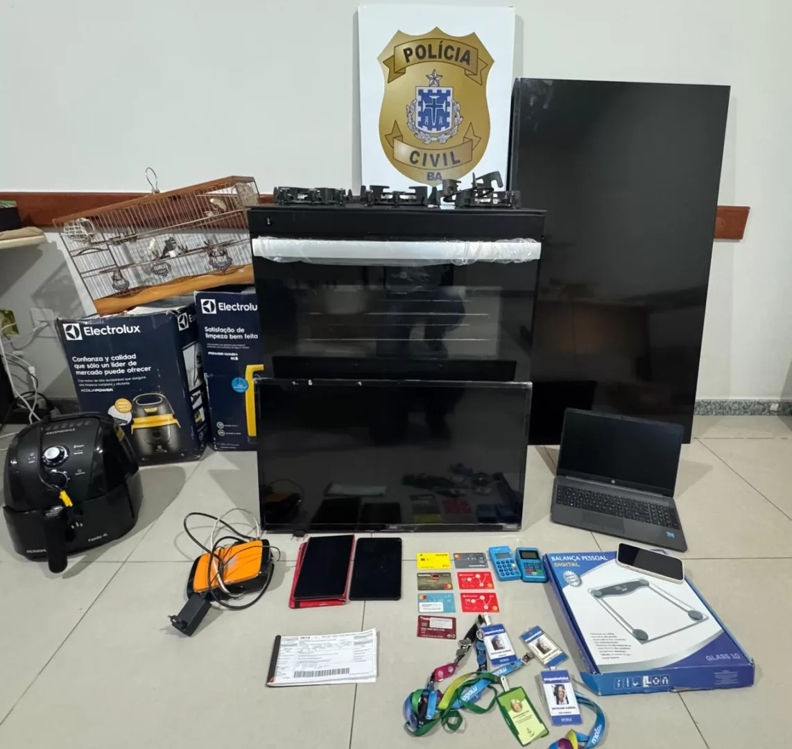 Durante o cumprimento de mandado de busca e apreensão no imóvel da suspeita, foram arrecadados diversos bens de origem não esclarecida, como notebook, iPhone, tablet, fogão e televisores, com indícios de terem sido adquiridos por meio da atividade criminosa.
