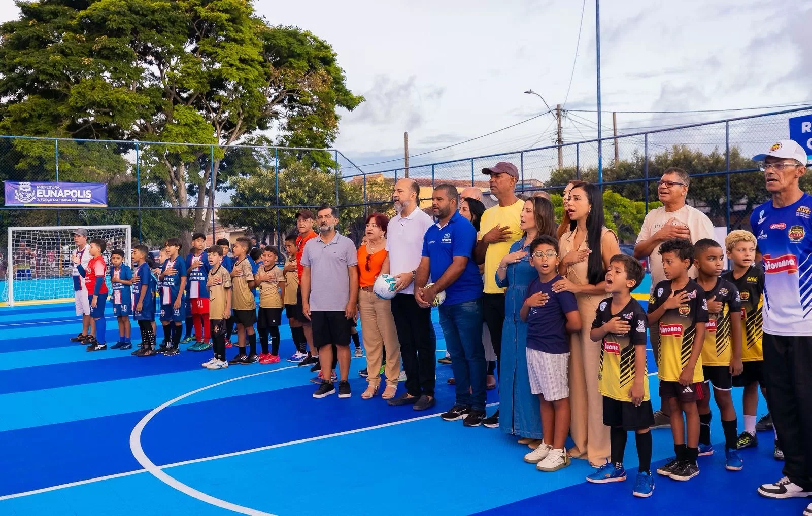 A Prefeitura de Eunápolis, por meio da Secretaria de Esporte, Cultura, Lazer e Juventude, realizou neste sábado (28) a entrega da quadra esportiva da Praça da Liberdade, totalmente revitalizada. O espaço voltou a ser utilizado pela comunidade com a realização de um torneio de futebol infantil, reunindo equipes de diversos bairros e promovendo integração entre atletas, famílias e moradores. Participaram do evento o prefeito Robério Oliveira, a primeira-dama e deputada estadual Cláudia Oliveira, além de secretários municipais, vereadores e representantes da sociedade civil.