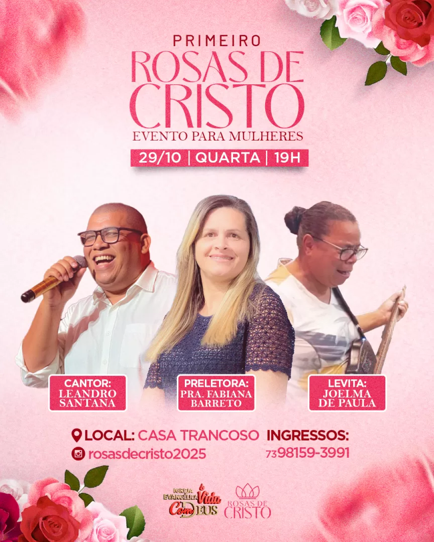 No próximo dia 29 de outubro, a partir das 19h, a cidade de Eunápolis será palco de um encontro especial voltado ao público feminino. O evento “Rosas de Cristo” será realizado na Casa Trancoso Eventos e promete reunir mulheres em uma noite marcada por fé, comunhão e espiritualidade.