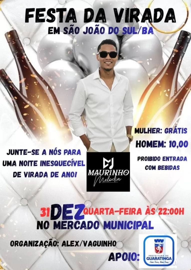O evento é organizado por Alex e Vaguinho e conta com o apoio da Prefeitura de Guaratinga. A Festa da Virada é uma opção de lazer para moradores do povoado e de comunidades vizinhas que desejam celebrar a chegada do novo ano com música e confraternização.