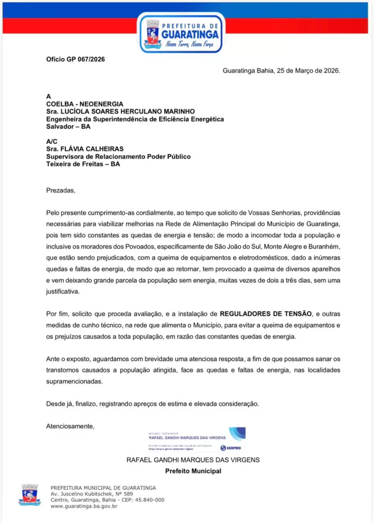 Em suas redes sociais, ele informou que já cobrou providências formais da concessionária de energia: “Encaminhamos ao setor responsável da Coelba um ofício solicitando melhorias na rede elétrica do nosso município. Nossa população vem sofrendo com constantes quedas de energia, o que prejudica diretamente comerciantes, serviços públicos e o dia a dia das famílias”, disse o prefeito.
